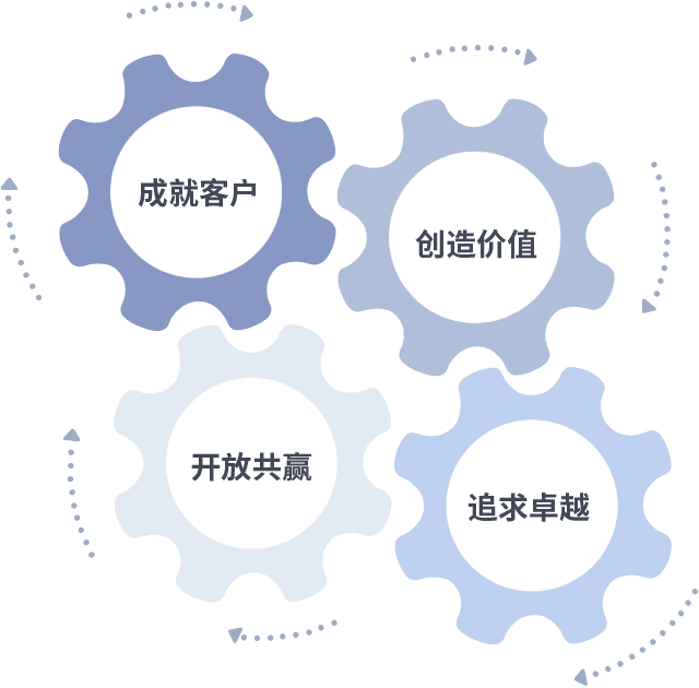 成就客户是一切决策的出发点,,,创造价值是衡量所有工作的标准,,,,追求卓越是我们做事做人的态度,,开放共赢是我们的格局也是最终的结果。。。。价值观的齿轮环环相扣,,,推动着组织里的每个人不断向前。。。。