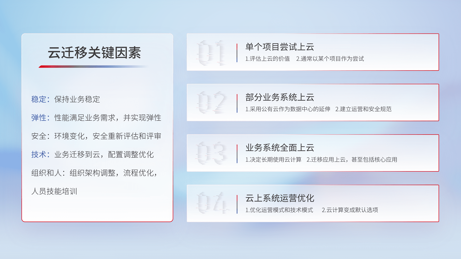 结合实际业务,,从规划设计、、、云平台选型、、、云原生改造、、、、数据迁移、、、、集成交付,,,,迁移全过程为客户识别最佳上云路径,,做好风险识别管理,,设计网络架构、、身份权限、、、、安全审计合规、、操作审计、、、日志审计、、、监控告警策略、、、、多站点容灾设计等,,对云上基础设施进行整体规划,,,,提升IT治理水平,,以满足弹性、、高可用、、、高性能的需求。。。